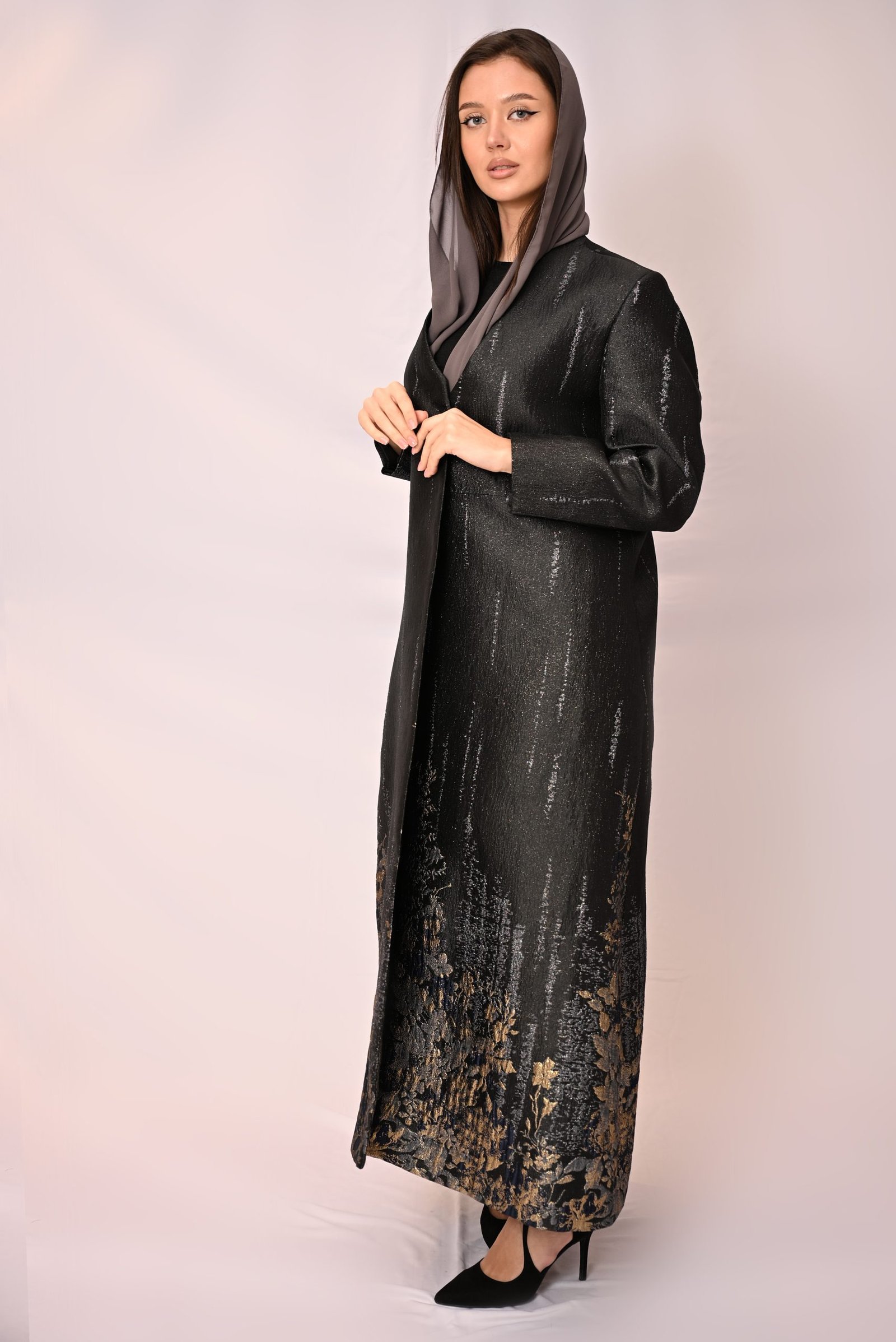 يزين الجزء السفلي من العباية تطريز ذهبي أنيق على شكل أزهار أو نقوش شرقية، مما يضيف لمسة فنية راقية وجاذبية خاصة على التصميم. تتميز العباية بياقة أنيقة وتصميم مفتوح من الأمام. يرافق العباية حجاب متناسق ليكمل أناقة الإطلالة.