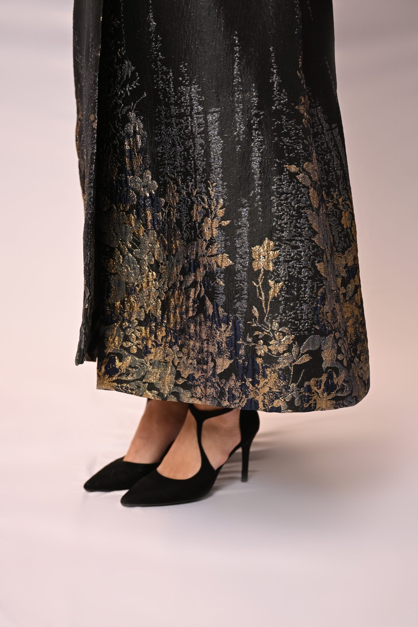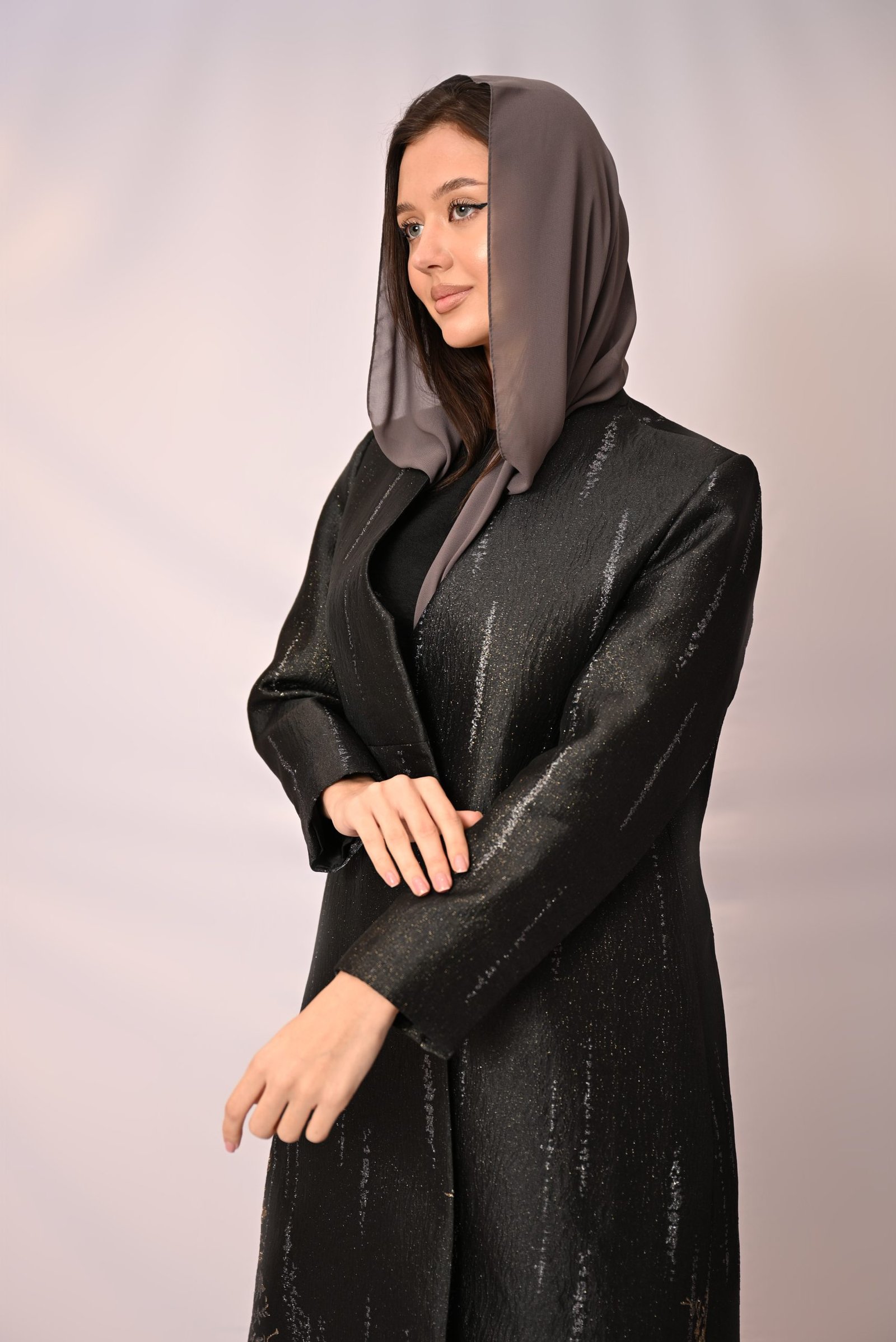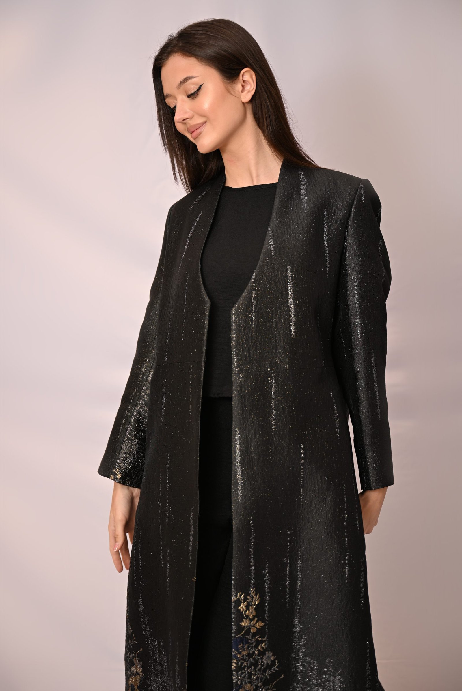 تألقي بأسلوب يمزج بين الأناقة العصرية واللمسة الشرقية الراقية مع هذه العباية البليزر الفريدة. صُممت هذه العباية بقصة أنيقة مستوحاة من البليزر، وتتميز بنقشة جاكار دقيقة باللون الأسود مع خيوط ذهبية تضفي عليها لمعاناً خفيفاً وفخامة أنيقة.