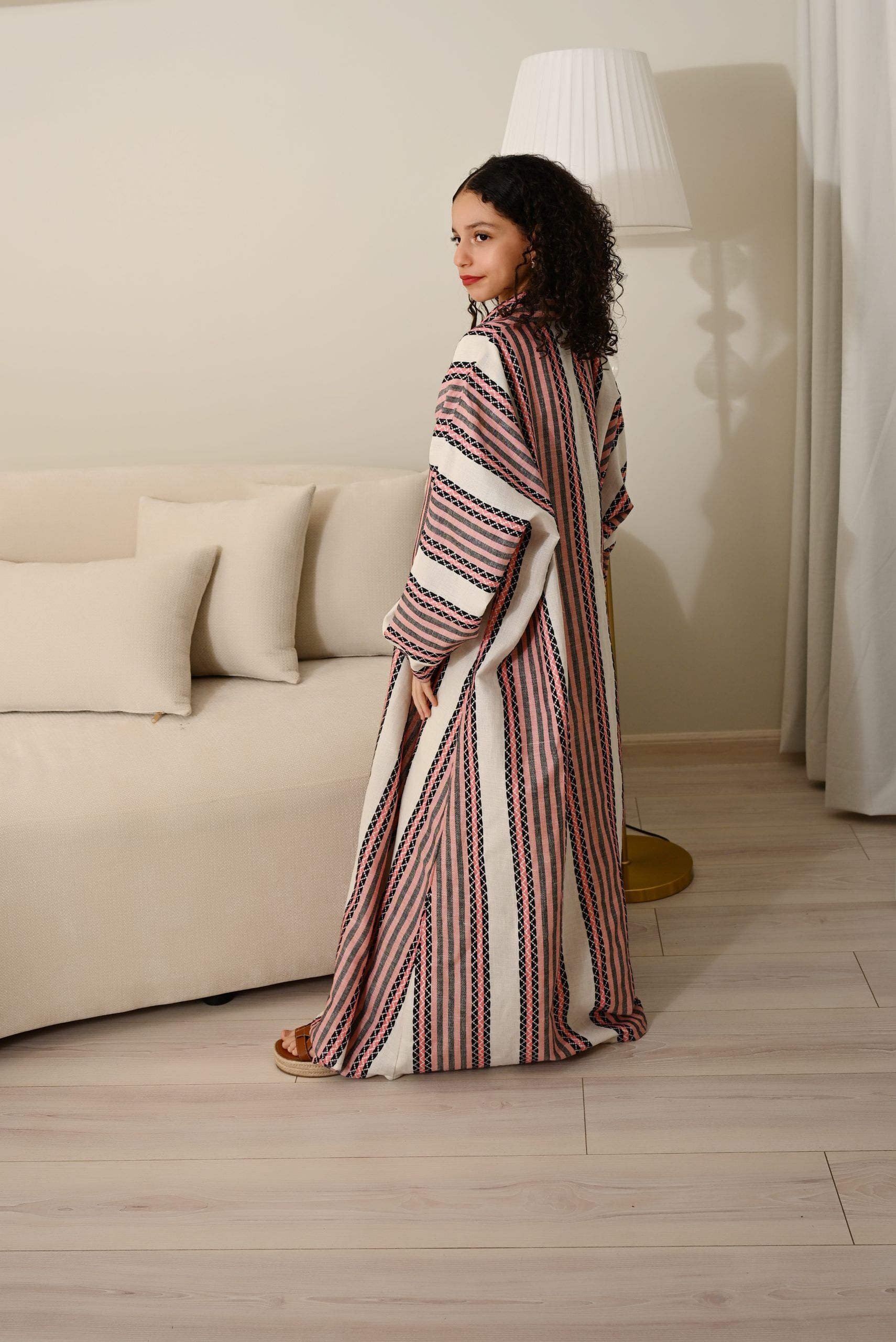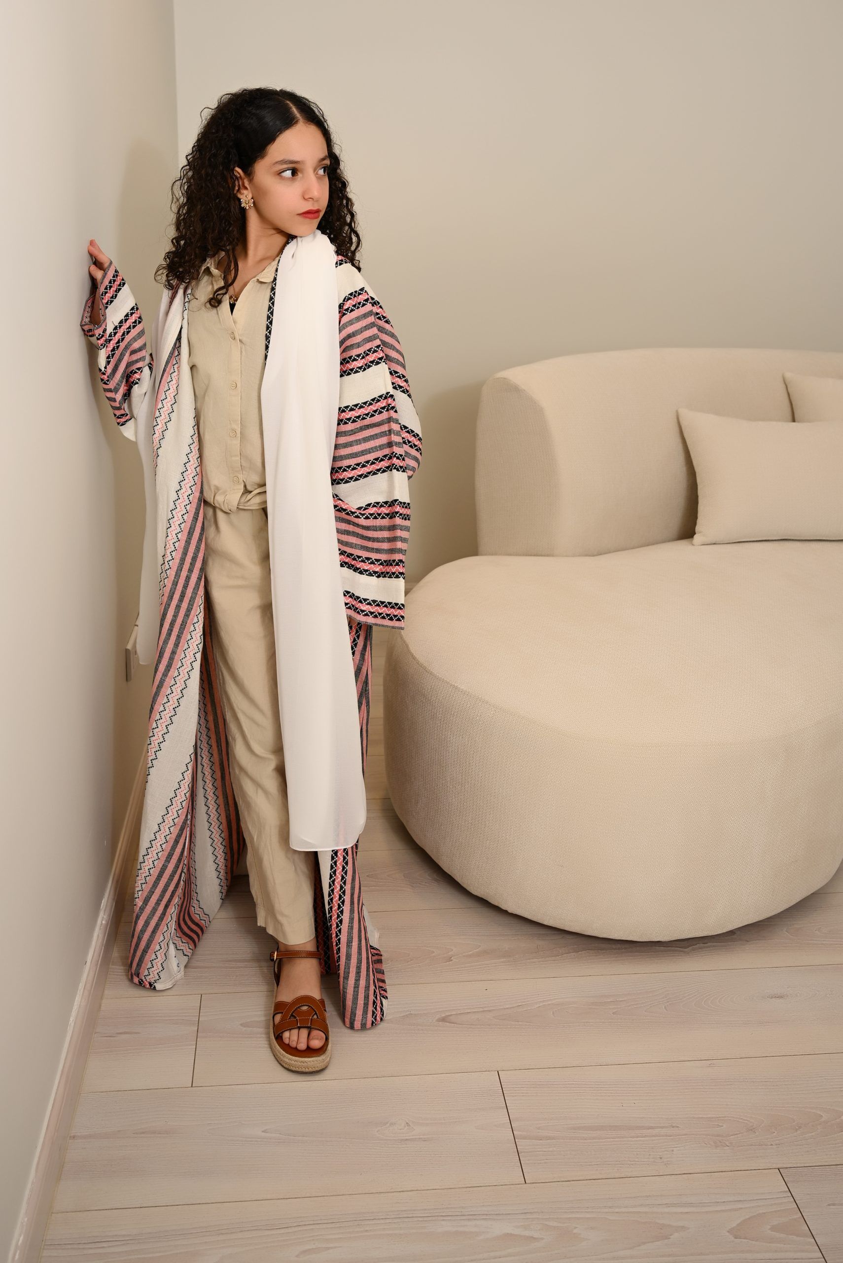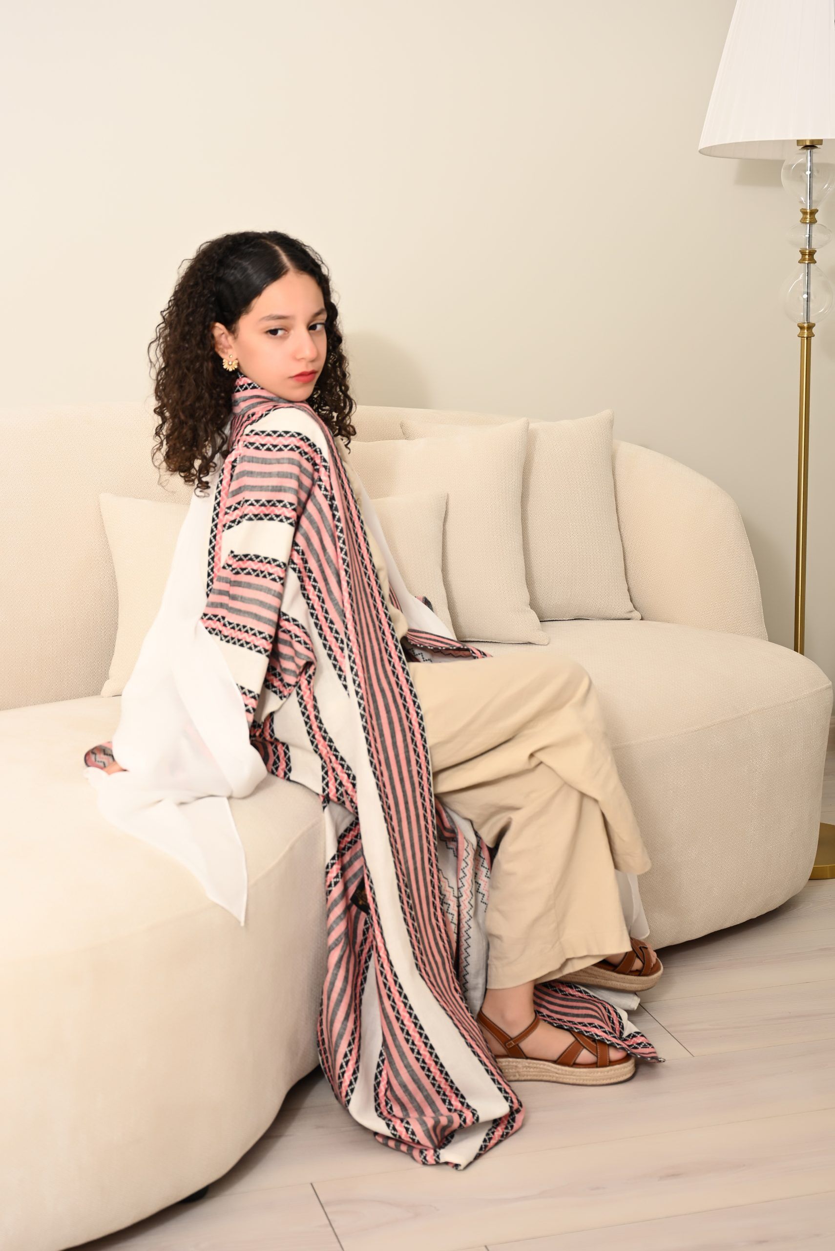 تتميز هذه العباية بتصميمها المبهج والحيوي، حيث يمتزج اللون الأبيض النقي مع خطوط عريضة باللون الوردي والأسود. هذه الألوان ليست مجرد مزيج عشوائي، بل هي اختيار يعكس شخصية الفتاة العصرية المفعمة بالحيوية والنشاط. النقوش الهندسية المتعرجة على طول حواف العباية تضفي لمسة من الأناقة والتفرد، مما يجعلها قطعة لا يمكن تجاهلها.