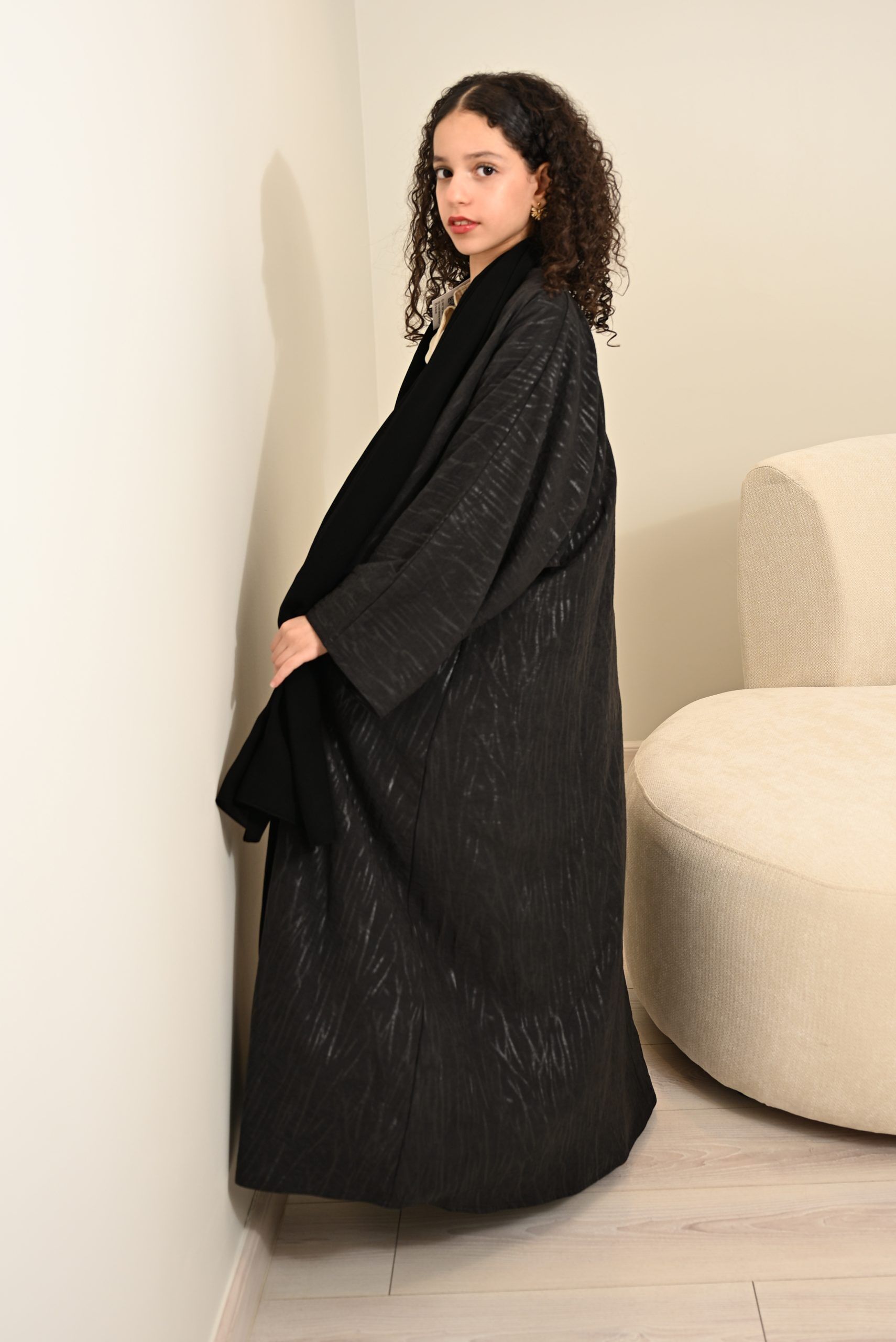 تُزين خيوط الزري العباية بنقوش دقيقة ولامعة، مما يمنحها بريقًا خفيفًا وجذابًا، دون أن يشتت الانتباه عن بساطة التصميم. هذه التفاصيل الصغيرة تضفي عليها لمسة من الفخامة، مما يجعلها مناسبة للمناسبات الرسمية والاحتفالات. القصة الواسعة والأنيقة تمنح الفتاة حرية الحركة، مما يجعلها مثالية للارتداء اليومي.