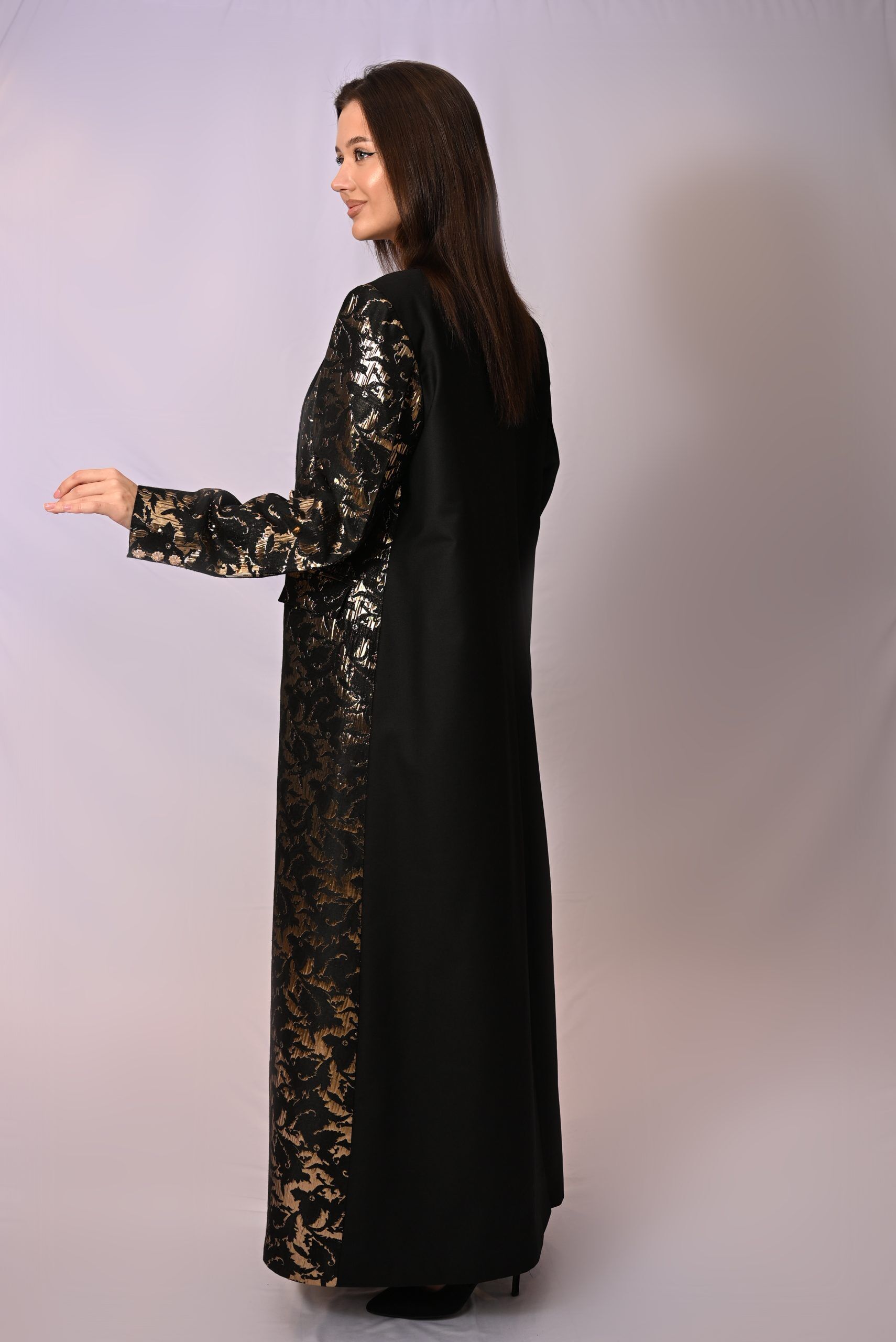 تتميز هذه العباية بتصميم مبتكر يجمع بين قماش الزركون الأسود الفاخر وقماش الجاكار الذهبي المزخرف بنقوش أنيقة. يضفي قماش الزركون الأسود على الجزء الأكبر من التصميم لمسة كلاسيكية أنيقة وقوية، بينما يبرز قماش الجاكار الذهبي في أحد الجانبين والأكمام ليمنح العباية فخامة وتألقًا لافتًا.