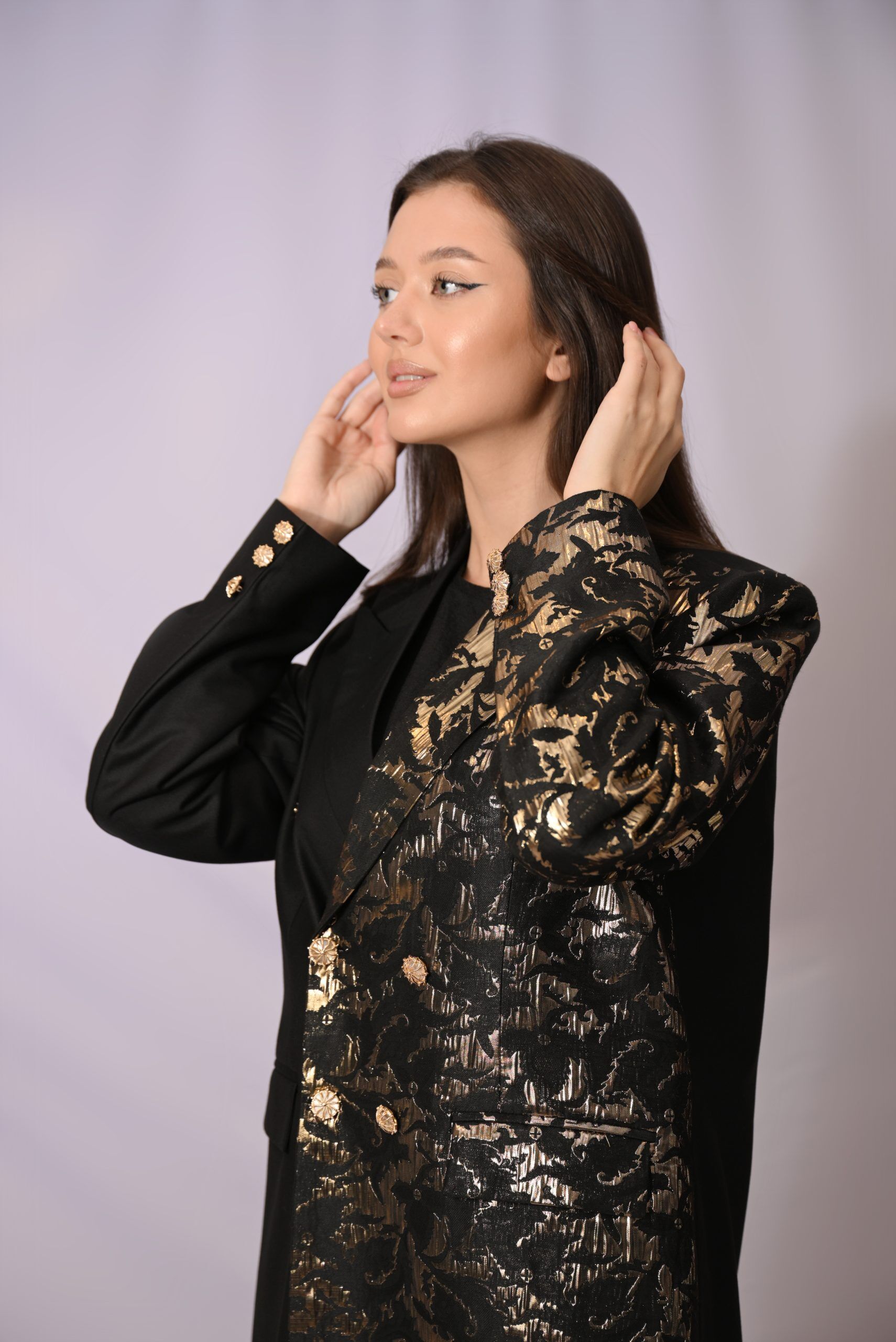 يأتي تصميم العباية بقصة البليزر الأنيقة مع ياقة محددة وأزرار ذهبية مزدوجة تضفي لمسة من الرقي والفخامة. الأكمام طويلة، حيث يبرز قماش الجاكار الذهبي في أحدها بالكامل ليضيف لمسة جريئة ومميزة. ينسدل التصميم بقصة واسعة ومريحة لتمنحك حرية الحركة والأناقة في آن واحد.