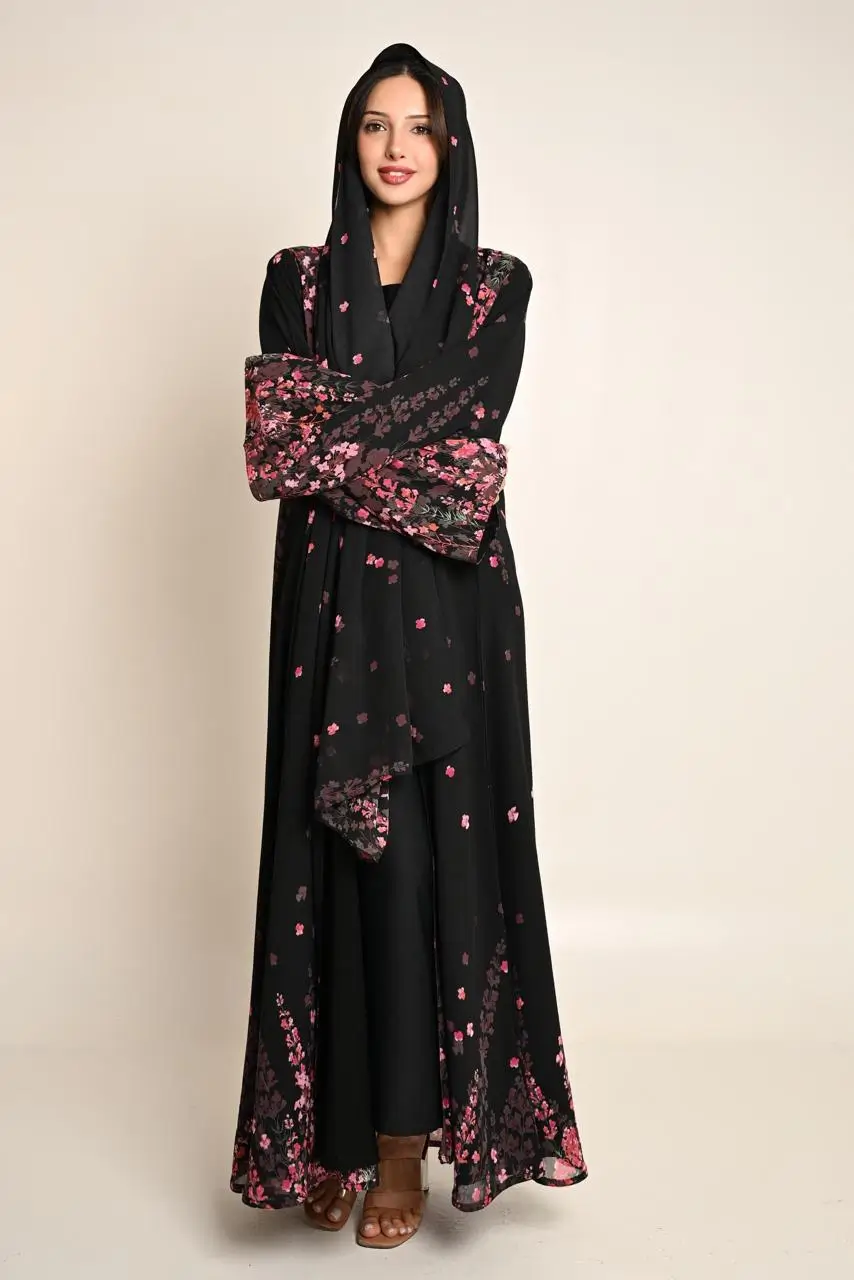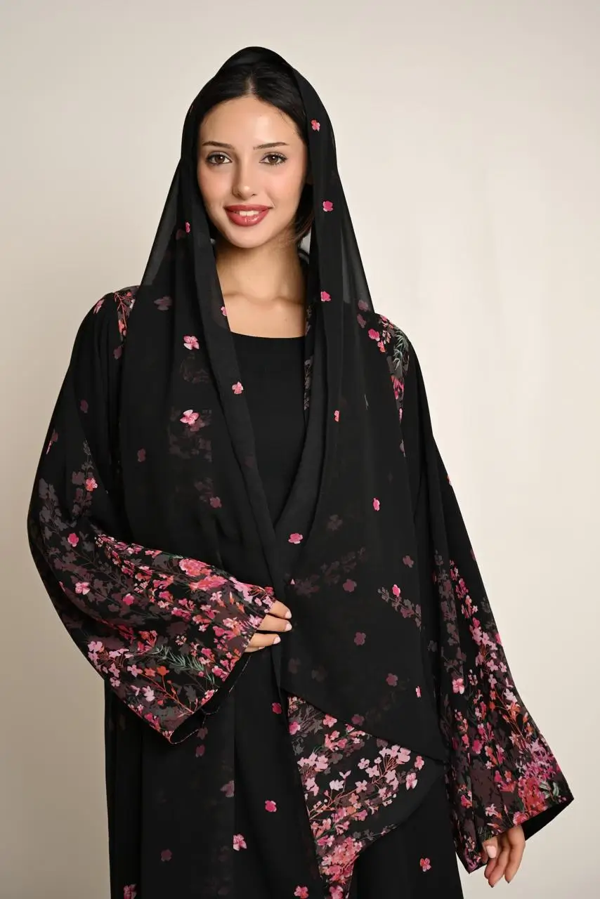 عباية صيفية سوداء بنقشة زهور وردية مع شال متناسق